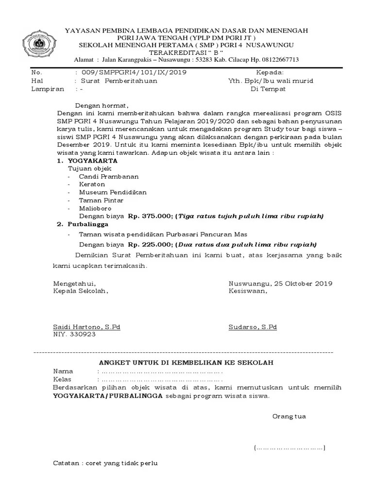 Contoh surat pemberitahuan rencana pelaksanaan study tour bagi siswa dtujukan kepada seluruh wali murid. Itulah sebuah teladan surat pemberitahuan yang ditujukan kepada orang tuawali murid ihwal pelaksanaan study tour yang dilaksanakan oleh sekolah. Contoh surat pemberitahuan study tour untuk wali murid. Setiap akan melaksanakan study tour, maka panitia terlebih dahulu harus membuat surat pemberitahuan kegiatan study tour yang ditujukan untuk . From img.dokumen.tips contoh surat pemberitahuan kegiatan sekolah.
